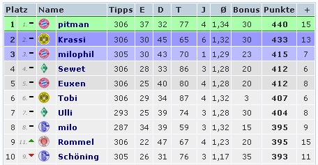 Am Ende der letzten Saison konnte sich Tipper "pitman" mit 440 Punkten vor "Krassi" (433 Punkte) und "milophil" (415 Punkte) durchsetzten.