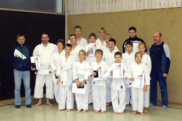 Von den Neulingen im Alter zwischen neun und vierzig Jahren haben jetzt dreizehn Karatekas die Prüfung zum 8. Kyu (Gelbgurt) bestanden.