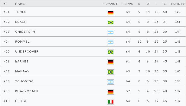 (mp) Mit etwas Verspätung wird an dieser Stelle nun das offizielle Ergebnis des WM-Tippspiels bekannt gegeben: