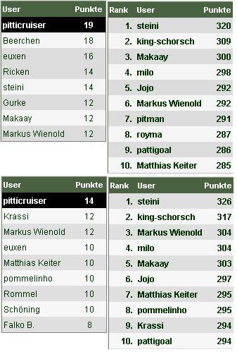 In der Gesamtwertung steht -immernoch- steini an der Spitze. "king-schorsch" kommt nach diesem Spieltag auf einen einstelligen Rückstand an den Führenden heran.