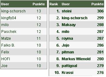 In der Gesamtwertung schließt der heutige Tagessieger wieder auf "steini" auf. Dieser erzielte 10 Punkte und durchbricht damit als erster die 300er-Marke, dennoch ist der Vorsprung auf mickrige 7 Zähler zusammengeschrumpft.