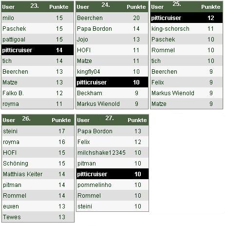 In der Gesamtwertung behauptet "steini" weiter seine Führung und möchte auch die komplette Saison als Sieger abschließen. "king-schorsch" ist ihm aber mit nur 7 Zählern Rückstand dicht auf den Versen. Zum dritten Platz tut sich eine kleine Lücke auf, die "royma" einem ausgelassenen Tipp zu verdanken hat. Die weiteren Top10-Platzierten befinden sich in Schlagdistanz.