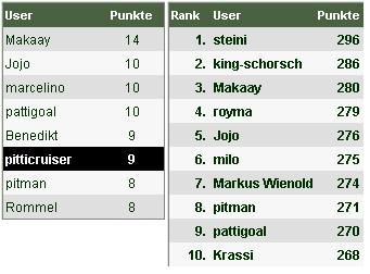 Der Gesamtführende "steini" holt 7 Zähler, kann seinen ärgsten Verfolger "king-schorsch" aber distanzieren, da dieser nur 4 Pünktchen erntet.