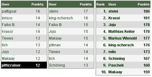 In der Gesamtwertung übernimmt "steini" mit nun 186 Punkten wieder die Pole Position und kann "Krassi" auf Distanz bringen (5 Pkt.). Die 200er-Marke zur Herbstmeisterschfat ist durchaus möglich.