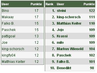 Dabei teilen sich "Bino" und "Makaay" mit 17 Punkten den Platz an der Sonne. Während "Bino" gleich drei Begegnungen korrekt vorhersagt, sind dies bei "Makaay" zwar nur zwei, dafür aber mehr Tendenzen richtig.