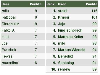 Einer dieser 1-Punkt-Strategen ist auch der Gesamtführende "steini", der aber Dank des insgesamt schlechten Ergebnisses nur geringfügig von seinem Vorsprung einbüßt. "Krassi" verbessert sich an diesem Spieltag von 4 auf 2 und bucht nun auch Dreistellig auf der Haben-Seite des Punktekontos.