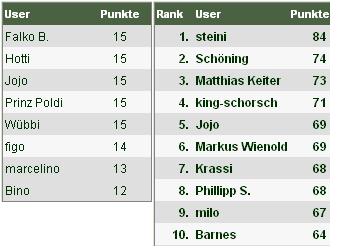 In der Gesamtwertung liegt weiter "steini" in Führung, der aber mit nur 5 Zählern ein wenig Vorsprung auf "Schöning" einbüsst. Dieser holt beachtliche 12 Punkte und schiebt sich an "Matthias Keiter" auf Platz zwei vorbei.
