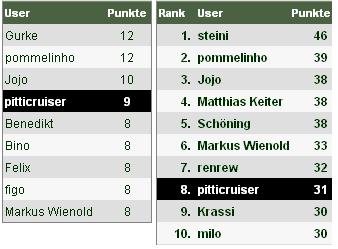 Dabei sagte "Gurke" das Remis der Schalker und "pommelinho" das der Duisburger korrekt vorraus. Zusätzlich ertippten sie sich jeweils in 4 Partien 2 Punkte.