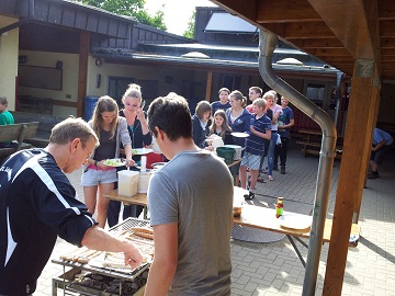 (ts) Auch am Montag war bei uns im Sommercamp das Wetter noch erträglich. So konnten wir wieder wunderbar den Tag mit viel Sport in Verbindung setzen. Über den ganzen Tag hindurch hatte allerdings auch jedes Zelt die Aufgabe eine eigene Fahne zum Camp zu erstellen. Diese sollen dann nachher zu einer großen verbunden werden. Zum Abendessen ließ die Witterung sogar ein grillen mit köstlichen Bratwürsten mit vielen verschiedenen Salaten zu. Dieses war die richtige Stärkung für die anstehende Stadtrally am Abend. Jedes Zelt bekam einen Zettel mit einigen Aufgaben wie "welche Schuhgröße haben alle Betreuer zusammen oder wie heißt der Bäcker in Neukirchen?" Ebenso musste ein Gedicht mit dem Namen des Zeltes erstellt werden. Der Sieger soll dann am Dienstag Abend verlesen werden, direkt nach dem Höhepunkt in jedem Jahr: Ein kompletter Tag im HANSAPARK!!! |