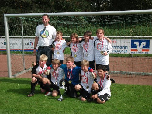 (la) Vom 10. - 12.09.2010 richtete der VfB Salzkotten den Tag des Jugendfussballs aus. Am Kreispokal-Turnier nahmen 32 E-Junioren-Teams des Altkreises Büren teil. In 8 Vorrundengruppen wurden die Teilnehmer der Endrunde ermittelt. So stiegen wir am Samstagmorgen in das Turnier ein und konnten unsere ersten beiden Spiele gegen Thüle und Tudorf II recht deutlich mit 4:0 und 8:1 gewinnen. Im abschließenden Spiel gegen RW Bentfeld reichte uns dann ein Unentschieden (2:2) um in die Finalrunde am Sonntag ein zu ziehen. Dort war unsere erster Gegner Wünnenberg/Leiberg, die wir mit 1:0 bezwingen konnten. Im zweiten Spiel schlugen wir Verne mit 3:0 und anschließend VfB Salzkotten mit 2:1. Somit erreichten wir, wie im Vorjahr, das Endspiel. Hier war unser Gegner der TSV Tudorf I, der sämtliche Spiele souverän gewonnen hatte.