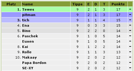Den ersten Spieltag gewinnt der Sieger des WM-Tipps "Tewes" zusammen mit "pitman". beide erreichen mit 2 korrekten Ergebnissen 17 Punkte. "tich" und "Ena" starten ähnlich gut in die neue Saison und können schon am morgigen 2. Spieltag einen Platz an der Sonne ergattern. |